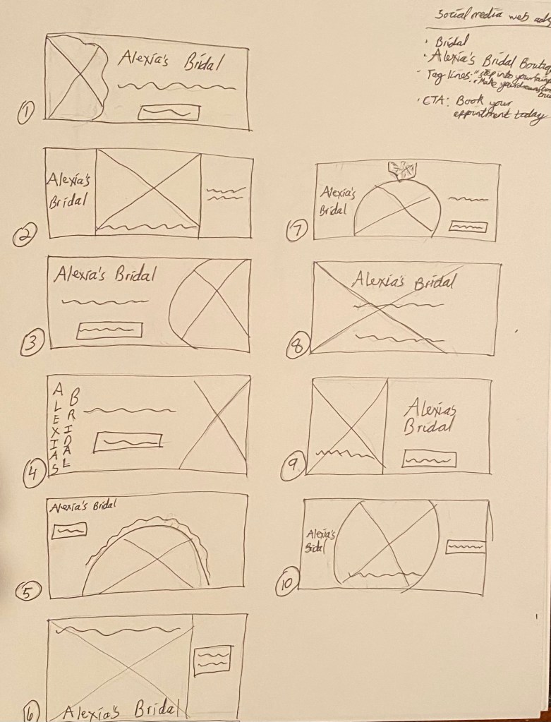 For this campaign, I created a series of web ads for fictional bridal boutique, Alexia’s Bridal. The end goal was to create an ad with a strong call-to-action that would catch the viewer’s attention and encourage them to click through to the boutique’s website and schedule an appointment. The ads also needed to be very visual.