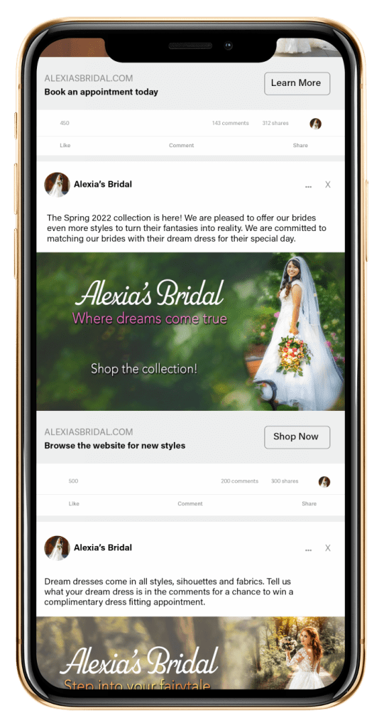 Finally, since this campaign focused on digital advertising, I included a website and social media to further the reach of Alexia’s Bridal. The campaign targets women between the ages of 20 and 35 years of age shopping for a wedding dress. As this demographic spends a lot of time online, these pieces are strategically chosen to reach brides who frequently shop online and use it browse wedding dress options.