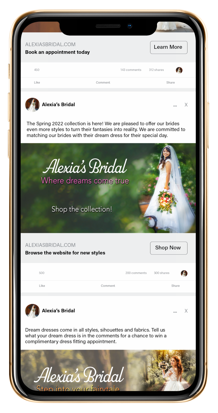 Finally, since this campaign focused on digital advertising, I included a website and social media to further the reach of Alexia’s Bridal. The campaign targets women between the ages of 20 and 35 years of age shopping for a wedding dress. As this demographic spends a lot of time online, these pieces are strategically chosen to reach brides who frequently shop online and use it browse wedding dress options.
