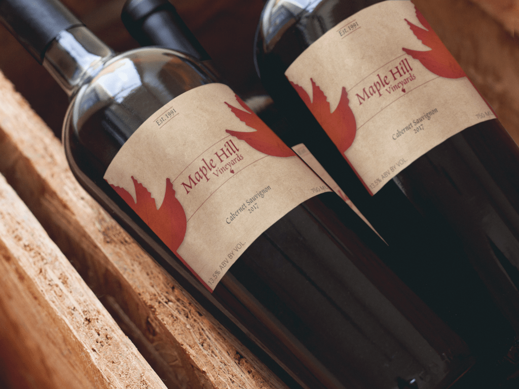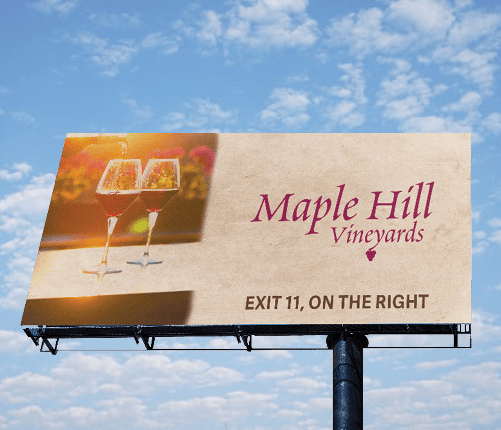 The intention for this campaign is to brand and promote the vineyard and its wine. Warm colors and textured maple leaves were used for the wine labels, and the color of the leaf varies with the varietal. A billboard is intended to bring additional guests to the vineyard.