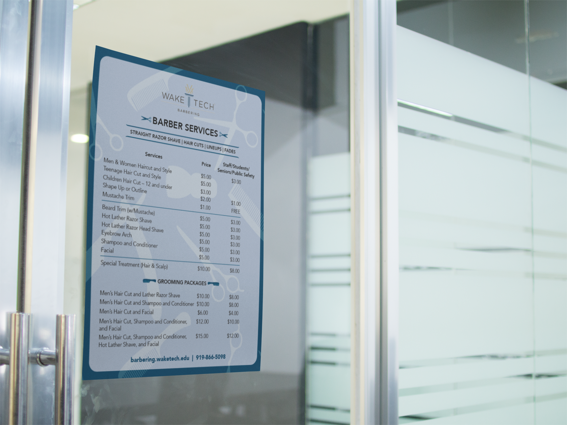 The Wake Tech Barbering students offer services to other students, faculty, staff, and the public. They requested a new sign with an updated design and prices. I incorporated barber shop motifs and the Wake Tech colors into the design